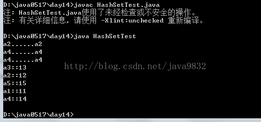 <p><span style="font-family: Arial, Helvetica, sans-serif; font-size: 12px;">/*</span></p><p>往hashSet集合中存入自定义对象 姓名和年龄视为同一个人,重复元素;</p> 定义一个对象通常要复写hashCode和equals,因为有可能你的对象要存到HashSet集合中; */ import java.util.*; class HashSetTest { public static void main(String[] args) { HashSet hs = new HashSet(); // 下面这些元素都有自己的哈希值, hs.add(new Person("a4",14)); hs.add(new Person("a1",11)); hs.add(new Person("a2",12)); hs.add(new Person("a2",12)); hs.add(new Person("a3",13)); hs.add(new Person("a4",14)); hs.add(new Person("a4",14)); hs.add(new Person("a5",15)); // sop("contains::"+hs.contains(new Person("a1",11)));//判断某个元素是否存在 // hs.remove(new Person("a2",12));//删除某个元素 Iterator it = hs.iterator(); while(it.hasNext()) { Object obj = it.next(); Person p = (Person)obj; sop(p.getName()+"::"+p.getAge()); } } public static void sop(Object obj) { System.out.println(obj); } } //描述人 class Person { private String name; private int age; // 覆盖Person的默认的hashCode方法,建立Person自己的hashCode方法; public int hashCode()//对象底层自己调用的; { // 按照姓名和年龄来生成一个哈希值; // 按照条件生成哈希值 // 字符串本身已经实现了hashCode,( String int hashCode() ) return name.hashCode()+age*26; } Person(String name,int age) { this.name = name; this.age = age; } public String getName() { return name; } public int getAge() { return age; } //对象底层自己调用的; public boolean equals(Object obj)//这个必须要做转换,而且要进行判断是不是这种类型 { if(!(obj instanceof Person)) return false; Person p = (Person)obj; System.out.println(this.name+"......"+p.name);//如果这句话打印了,代表equals被调用了; return this.name.equals(p.name) && this.age==p.age; } }5、运行结果