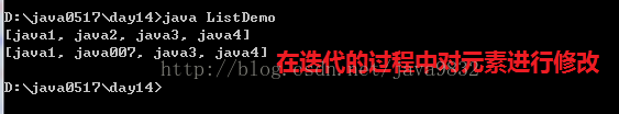import java.util.*; class ListDemo { public static void main(String[] args) { ArrayList al = new ArrayList(); al.add("java1"); al.add("java2"); al.add("java3"); al.add("java4"); sop(al); ListIterator li = al.listIterator(); while(li.hasNext()) { Object obj = li.next(); // 在迭代的过程中,判断元素,并操作元素 if(obj.equals("java2")) // li.add("java009");//在遍历的过程中添加了新的元素 li.set("java007");//在遍历的过程中修改元素 } sop(al); /* ListIterator li = al.listIterator();//因为add是ListIterator里面特有的方法。所以不好用父类Iterator while(li.hasNext()) { Object obj = li.next(); if(obj.equals("java2")) li.add("java009"); } sop(al); Iterator it = al.iterator(); while(it.hasNext()) { Object obj = it.next(); if(obj.equals("java2")) // al.add("java008");//不能用集合的方法了。只能用迭代器的方法。 it.remove(); sop("obj="+obj); } sop(al); */ } public static void sop(Object obj) { System.out.println(obj); } }8、运行结果