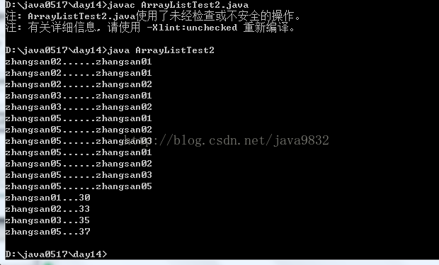 /* 将自定义对象作为元素存到ArrayList集合中,并去除重复元素, 比如:存人对象,同姓名同年龄,视为同一个人,为相同元素; 思路: 1、对人进行描述,将数据封装进人对象; 2、定义容器,将人存入; 3、取出 这边的判断元素是否相同用的是contains方法,包含,而contains的底层原理就是equals; List集合判断元素是否相同,依据的是元素的equals方法; */ import java.util.*; //而这个Person里面也是有equals方法的,因为Person本身继承Object,但是这个equals方法比较的是地址值; //而我的这个6个地址值都是不相同的 class Person { private String name; private int age; //下面的两个equals是不同的,一个是覆盖的Object里面的equals方法,一个是字符串姓名内容的比较。 // 需要重新equals,判断的是姓名和年龄 public boolean equals(Object obj)//这个equals是Person类里面的方法 { // 判断是不是Person类,而不是Demo if(!(obj instanceof Person)) return false; // 强转 Person p = (Person)obj; System.out.println(this.name+"......"+p.name); return this.name.equals(p.name) && this.age==p.age;//这个equals是判断字符串是否相同的方法 } /**/ Person(String name,int age) { this.name = name; this.age = age; } // 获取 public String getName() { return name; } public int getAge() { return age; } } class ArrayListTest2 { public static void main(String[] args) { // ArrayList判断的是对象是否相同,用的是equals,而所有的对象都是相同的 // ArrayList里面判断元素是否相同用的是equals方法; // 返回来的是true就是相同,返回为false就是不相同 ArrayList al = new ArrayList(); al.add(new Person("zhangsan01",30));//Object obj = new Person("zhangsan",30) 多态 al.add(new Person("zhangsan02",33)); al.add(new Person("zhangsan02",33)); al.add(new Person("zhangsan03",35)); al.add(new Person("zhangsan05",37)); al.add(new Person("zhangsan05",37)); al = singleElement(al); // 想要删除一个元素,那么就要拿着这个元素到集合里面去找,怎么去找就是用的equals; // sop("remove 03:"+al.remove(new Person("zhangsan05",37))); Iterator it = al.iterator(); while(it.hasNext()) { // Object obj = it.next();//it.next()返回来的是obj // Person p = (Person)obj;//想要访问子类的特有的方法的时候需要向下转型。 Person p = (Person)it.next();//想要访问子类的特有的方法的时候需要向下转型。 sop(p.getName()+"..."+p.getAge()); } } // 这个是去除重复的方法; public static ArrayList singleElement(ArrayList al) { ArrayList newAl = new ArrayList(); Iterator it = al.iterator(); while(it.hasNext()) { Object obj = it.next(); if(!newAl.contains(obj))//是否包含用的是contains;调用一次contains,contains就调用一次equals newAl.add(obj); } return newAl; } public static void sop(Object obj) { System.out.println(obj); } }15、运行的结果