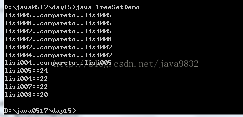 /* 往TreeSet集合中存储自定义对象学生 想按照学生的年龄进行排序; */ import java.util.*; class TreeSetDemo { public static void main(String[] args) { TreeSet ts = new TreeSet(); ts.add(new Student("lisi005",24)); ts.add(new Student("lisi008",20)); ts.add(new Student("lisi007",22)); ts.add(new Student("lisi007",22)); ts.add(new Student("lisi004",22)); // ts.add(new Student("lisi54",26)); Iterator it = ts.iterator(); while(it.hasNext()) { // Object obj = it.next(); // Student stu = (Student)obj; Student stu = (Student)it.next(); sop(stu.getName()+"::"+stu.getAge()); } } public static void sop(Object obj) { System.out.println(obj); } } //Comparable该接口强制让学生具备比较性 class Student implements Comparable { private String name; private int age; // 返回的是一个int型的数据;需要传一个对象进来; public int compareTo(Object obj) { // return 1;//怎么存进去的,就怎么取出来。 // return -1;//反着取出元素 // return 0;//元素都是相同的 /* 按照年龄和姓名进行排序。*/ if(!(obj instanceof Student)) throw new RuntimeException("此对象不是学生");//抛出的是RuntimeException异常,不是Exception异常 Student s =(Student)obj;//如果是学生的话,就强转 System.out.println(this.name+"..compareto.."+s.name); if(this.age<s.age) return 1; // 当主要条件相同,就要判断次要条件; // 当年龄相等时,就要比较姓名 // int compareTo(String anotherString) if(this.age==s.age) return this.name.compareTo(s.name); return -1; } Student(String name,int age) { this.name = name; this.age = age; } public String getName() { return name; } public int getAge() { return age; } }3、运行结果