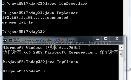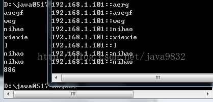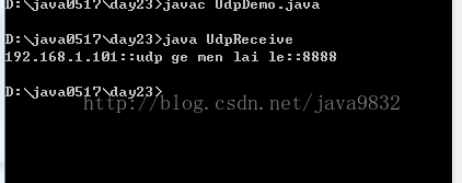 <span style="font-family:Microsoft YaHei;font-size:14px;">import java.io.*; import java.net.*; //只要用到net包就要用到io包 class UdpSend2 { public static void main(String[] args)throws Exception { DatagramSocket ds = new DatagramSocket(); // 键盘录入 BufferedReader bufr = new BufferedReader(new InputStreamReader(System.in)); // 读取数据 String line =null; while((line = bufr.readLine())!=null) { // 判断结束标记 if("886".equals(line)) break; // 不是886就要先变成字节数据 byte[] buf = line.getBytes(); // 封装成数据包,获取对方的主机地址 DatagramPacket dp = new DatagramPacket(buf,buf.length,InetAddress.getByName("192.168.1.101"),10001); // 发送数据包 ds.send(dp); } ds.close(); } } //定义接收端 class UdpReceive2 { public static void main(String[] args)throws Exception { DatagramSocket ds = new DatagramSocket(10001); while (true) { // 定义一个缓冲区; byte[] buf = new byte[1024]; DatagramPacket dp = new DatagramPacket(buf,buf.length); // 拿到数据包 ds.receive(dp); // 拿数据包里面的数据 String ip = dp.getAddress().getHostAddress(); String data = new String(dp.getData(),0,dp.getLength()); System.out.println(ip+"::"+data); } } }</span><span style="font-size:18px;"> </span>5、运行结果