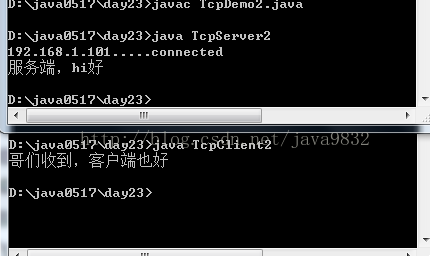 <span style="font-family:Microsoft YaHei;">import java.io.*; import java.net.*; class TcpClient2 { public static void main(String[] args) throws Exception { Socket s = new Socket("192.168.1.101",10004); // 拿到输出流对象 OutputStream out = s.getOutputStream(); // 写入数据 out.write("服务端,hi好".getBytes()); // 读服务端反馈的数据 InputStream in = s.getInputStream(); byte[] buf = new byte[1024]; int len = in.read(buf); System.out.println(new String(buf,0,len)); s.close(); } } //服务端 class TcpServer2 { public static void main(String[] args) throws Exception { ServerSocket ss = new ServerSocket(10004); // 拿到客户端对象 Socket s = ss.accept(); // 拿到客户端的IP地址 String ip = s.getInetAddress().getHostAddress(); System.out.println(ip+".....connected"); // 读取客户端的数据 InputStream in = s.getInputStream(); byte[] buf = new byte[1024]; int len = in.read(buf); System.out.println(new String(buf,0,len)); // 要给客户端反馈信息 OutputStream out = s.getOutputStream(); out.write("哥们收到,客户端也好".getBytes()); s.close(); ss.close(); } }</span>