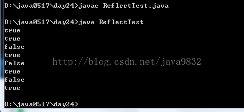 <span style="font-family:Microsoft YaHei;">class ReflectTest { public static void main(String[] args) throws Exception { String str1 ="abc"; // 得到String类型的字节码 Class cls1 = str1.getClass(); Class cls2 = String.class; Class cls3 = Class.forName("java.lang.String"); System.out.println(cls1 == cls2); System.out.println(cls1 == cls3); // 看cls1的字节码是否是原始类型,String类型不是基本类型的字节码 System.out.println(cls1.isPrimitive()); // int的字节码是否是基本类型的字节码 System.out.println(int.class.isPrimitive()); // 看看int类型的字节码和Integer类型的字节码是否相同 System.out.println(int.class == Integer.class); // Integer.TYPE代表的是包装类型所包装的那个基本类型的字节码 System.out.println(int.class == Integer.TYPE); // 数组类型的int是不是元素类型,是一个数组 System.out.println(int[].class.isPrimitive()); // 判断是不是数组 System.out.println(int[].class.isArray()); } }</span>6、运行结果