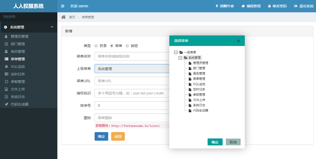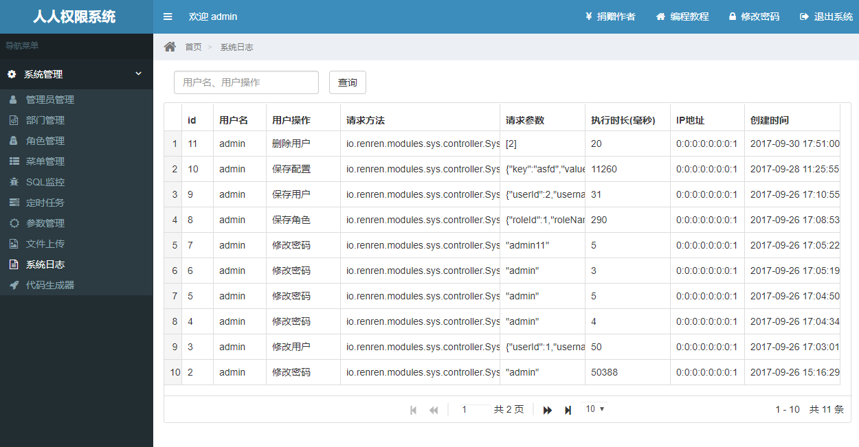 - 管理员管理、角色管理、部门管理,可操作本部门及子部门数据