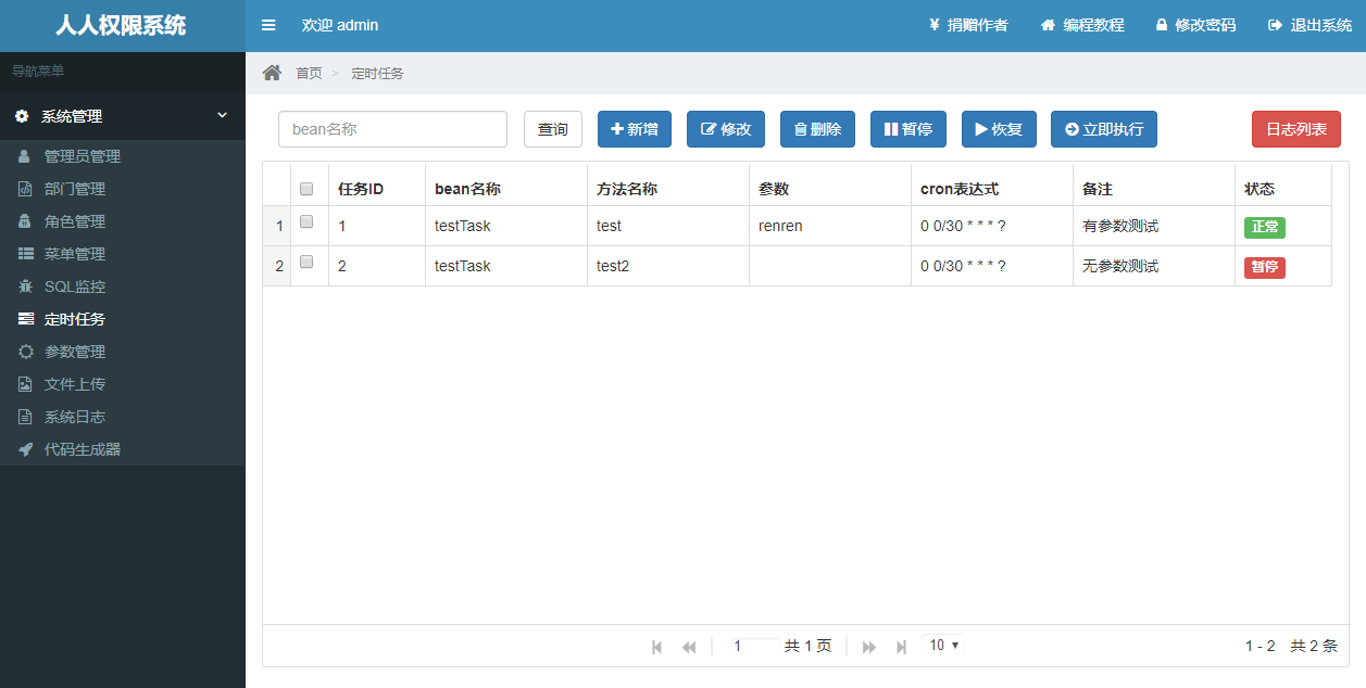 - 引入quartz定时任务,可动态完成任务的添加、修改、删除、暂停、恢复及日志查看等功能