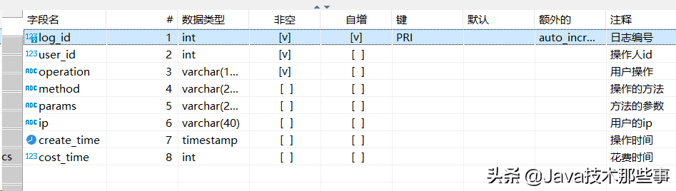 `log_id` int NOT NULL AUTO_INCREMENT COMMENT '日志编号',