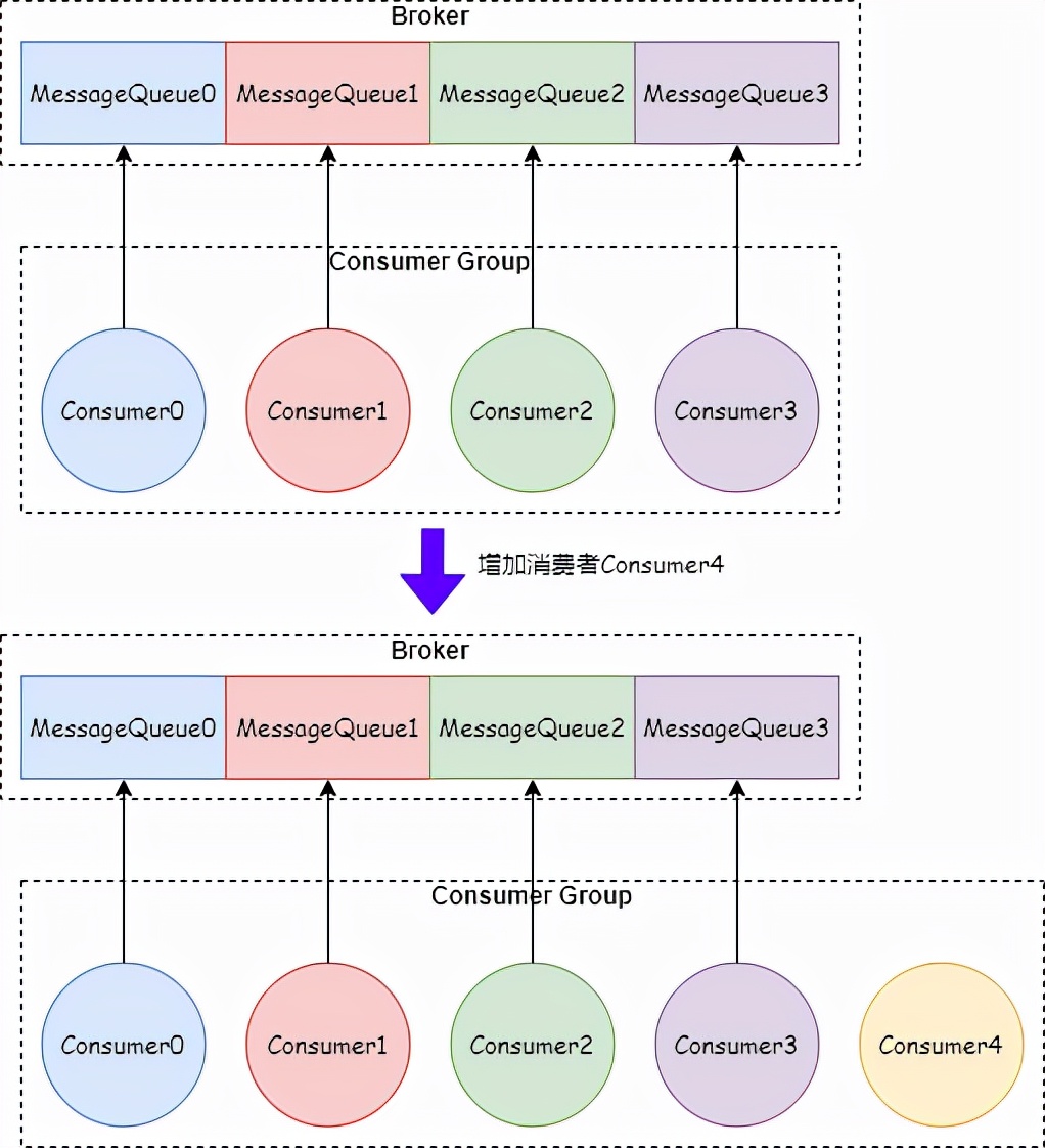 如果消费者的数量大于等于 MessageQueue 的数量,增加消费者是没有用的。比如一个 Topic 有 4 个 MessageQueue,并且有 4 个消费者进行消费。如下图