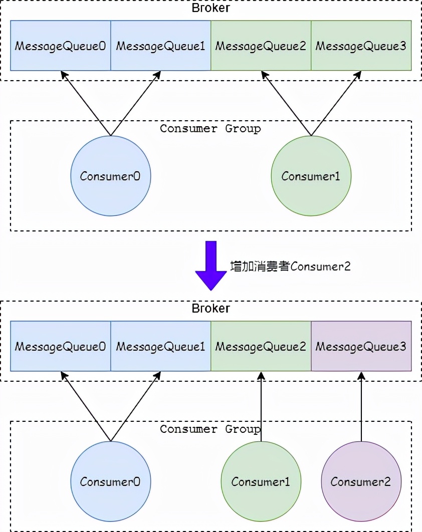 我:如果消费者的数量小于 MessageQueue 的数量,增加消费者可以加快消 息消费速度,减少消 息积压。比如一个 Topic 有 4 个 MessageQueue,2 个消费者进行消费,如果增加一个消费者,明细可以加快拉取消息的频率。如下图: