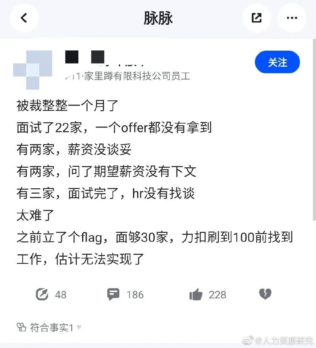 “被裁整整一个月了,面试了22家,一个offer都没有拿到”