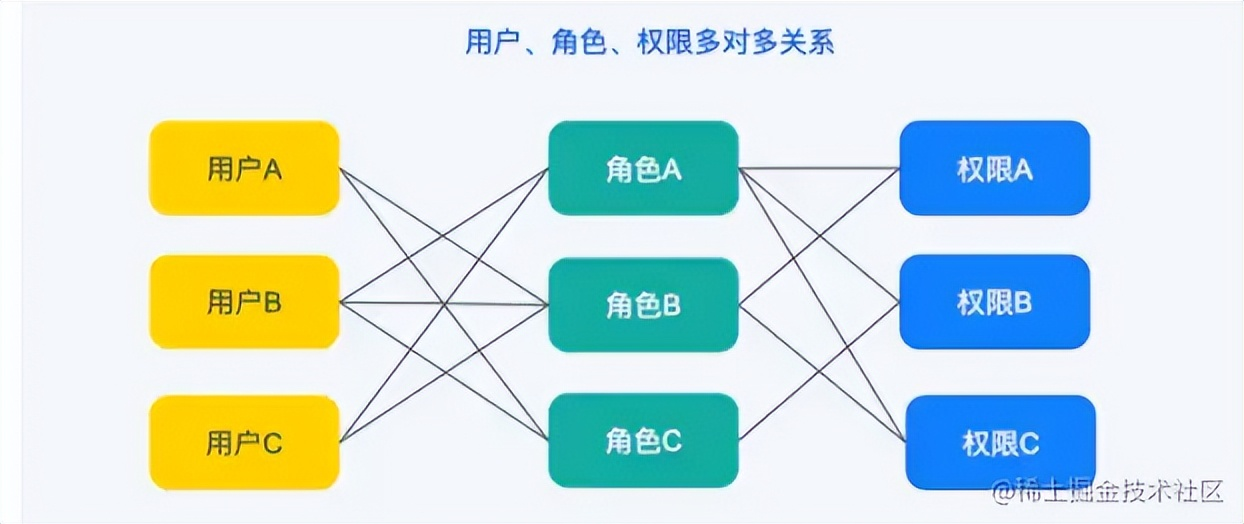 简单来说就是一个用户拥有多个角色,一个角色可以被多个用户拥有,这是用户和角色的多对多关系;同样的,角色和权限也是如此。