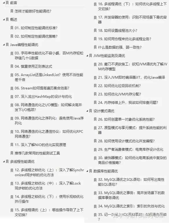 Java 性能调优包含:Java编程调优、多线程调优、JVM调优、设计模式调优、数据库性能调优,每个层级都会遇到不同的问题。这份笔记带你从实战出发,精选高频性能问题,透过Java 底层源码,提炼出优化思路和实现原理,形成一套学完即用的调优方法论。