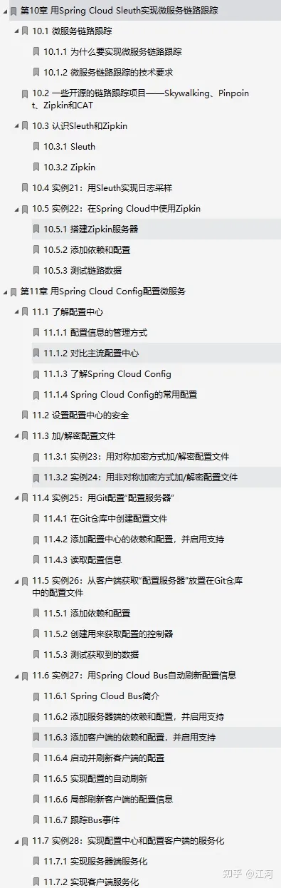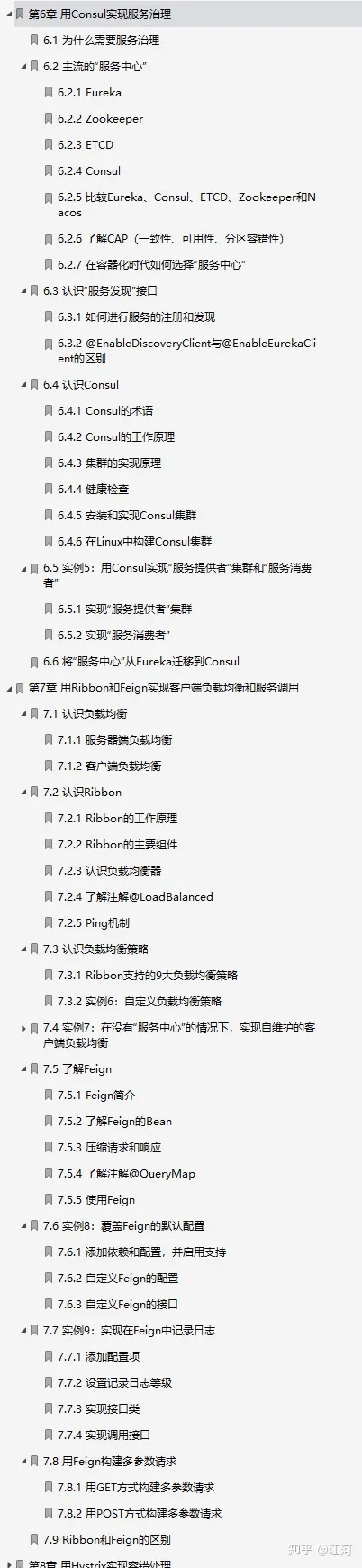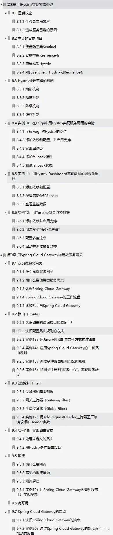 主要包括了6-13章的内容(用Consul实现服务治理、用Ribbon和Feign实现客户端负载均衡和服务调用、用Hystrix实现容错处理、用Spring Cloud Gateway构建微服务网关、用Spring Cloud Sleuth实现微服务链路跟踪、用Spring Cloud Config配置微服务用Spring Cloud Alibaba组件实现服务治理和流量控制、用Spring Cloud Security实现微服务安全)
