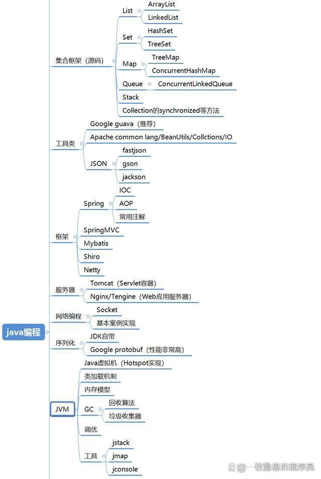 4、并发编程 通过深入了解最底层的运作原理,加强逻辑思维,才能编写出高效、安全的多线程并发程序。 包括:集合框架(源码)、工具类、框架Spring、SpringMVC、Mybatis、Shiro、Netty、服务器(tomcat、Nginx)、网络编程、序列化、JVM等。