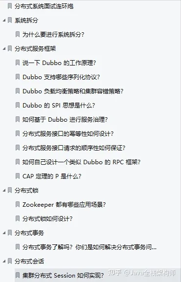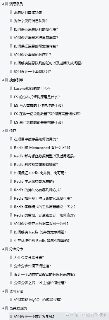 宝典从Java进阶面试常问5大模板(高并发架构,分布式系统、高可用架构、微服务架构、海量数据处理)逐一展开,内容覆盖消息队列,搜索引擎,缓存,分库分表,读写分离,分布式锁,分布式事务,限流,熔断等核心知识,内容太多我就不在此一一展开了,需要完整版的小伙伴点这里: 传送门 即可获取~