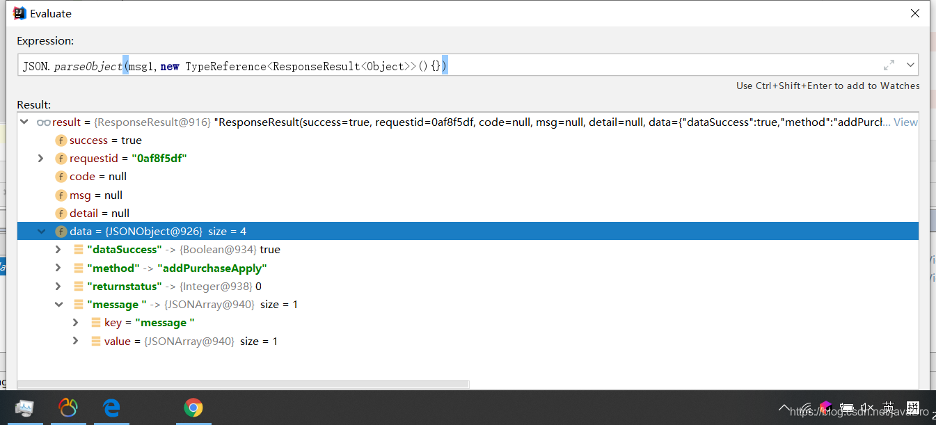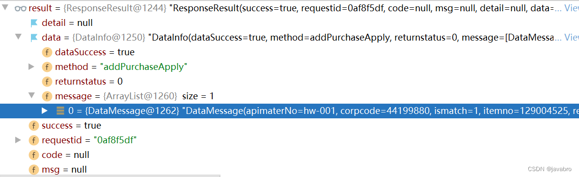String jsonStr="{\"success\":true,\"requestid\":\"0af8f5df\",\"code\":null,\"msg\":null,\"detail\":null,\"data\":{\"dataSuccess\":true,\"message\":[{\"apimaterNo\":\"hw-001\",\"corpcode\":\"44199880\",\"ismatch\":\"1\",\"itemno\":\"129004525\",\"remark\":\"对照\",\"requestno\":\"201912121336445344\"}],\"method\":\"addPurchaseApply\",\"returnstatus\":0}}";