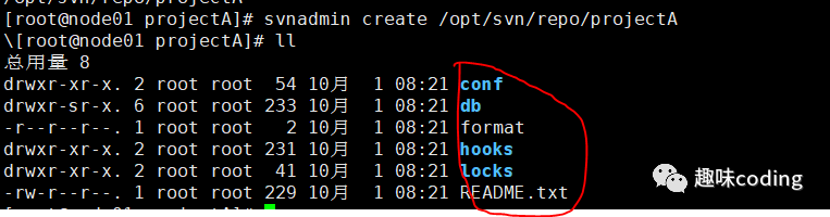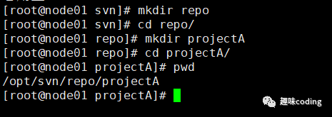 使用 svnadmin create /opt/svn/repo/projectA指令创建svn版本库