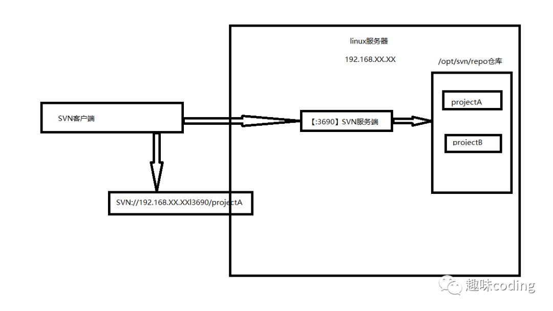 检出 svn checkout svn://192.168.XXX.XXX/projectA