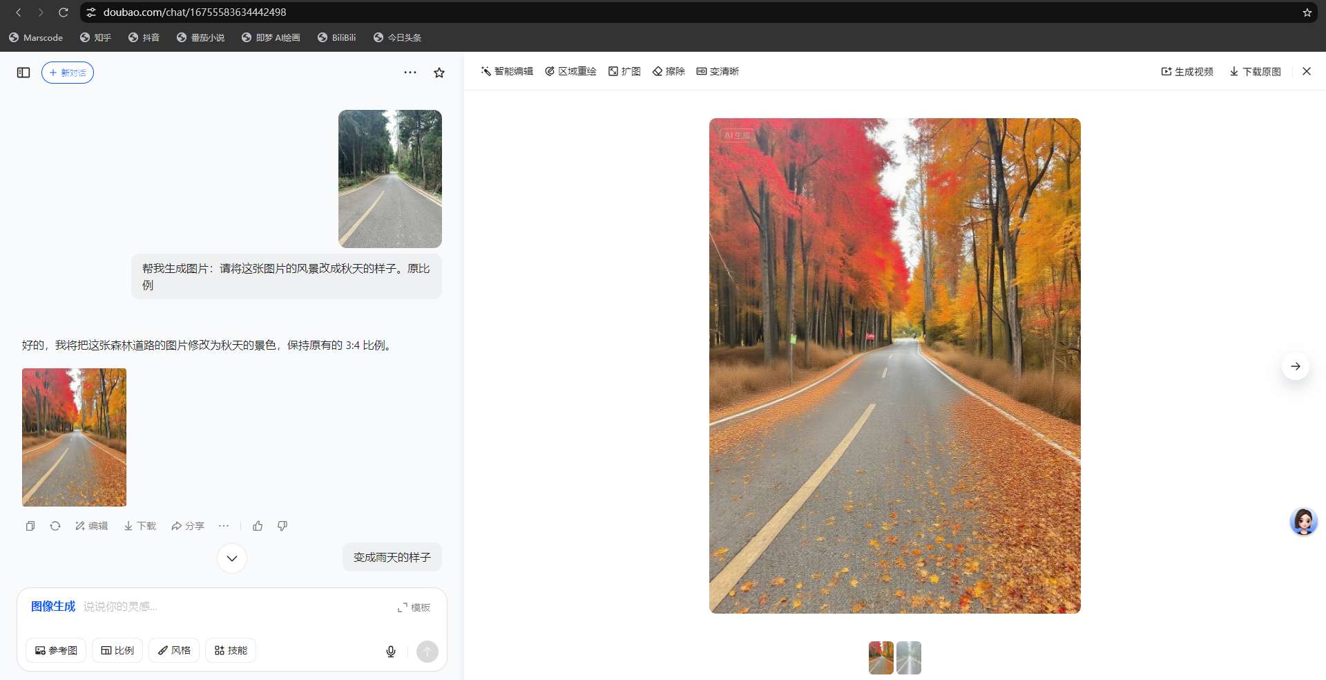 然后将地图和你要修改的想法告诉deepseek,让他给你一个修改的提示词,在将这个提示词给到豆包,即可完成一个产品设计图。 - 输入具体需求(如:“帮我生成图片:请将这张图片的风景改成秋天的样子。原比例”)
