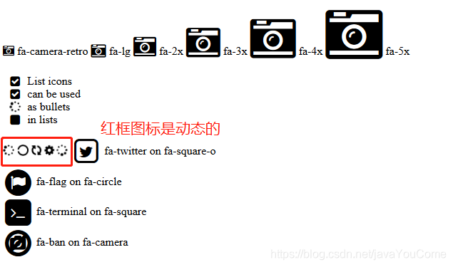 然后页面中推荐使用<i>作为图标的标签,class属性中必须加 fa 作为前缀 后面是图标本身的名字