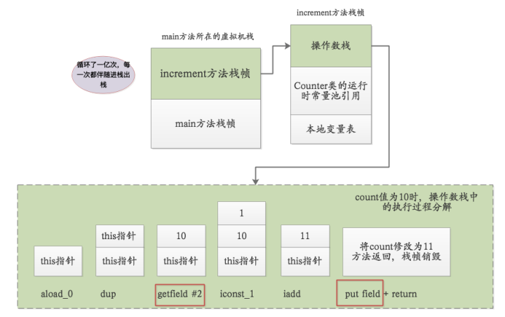 我们知道Java中方法的调用是基于栈帧实现的,每个栈帧中主要包含操作数栈+用到类的运行时常量池引用+本地变量表。我画了一张示意图帮助大家理解整个执行过程,并且将其中一次count++操作的字节码在操作数栈中的执行步骤分解了(以count=10为例),这里要注意,下面这张图的运行是在工作内存中(main方法所在线程的虚拟机栈中)。