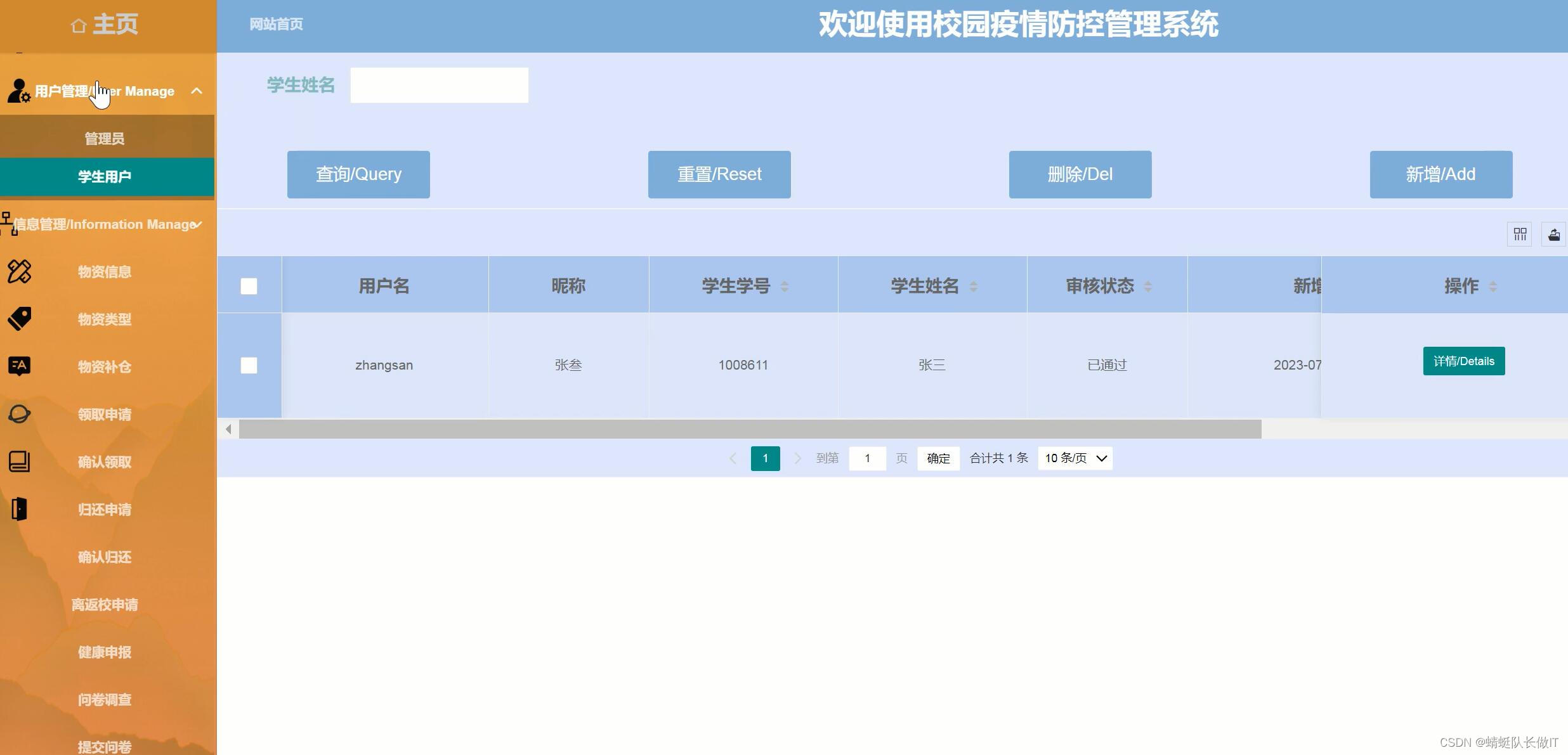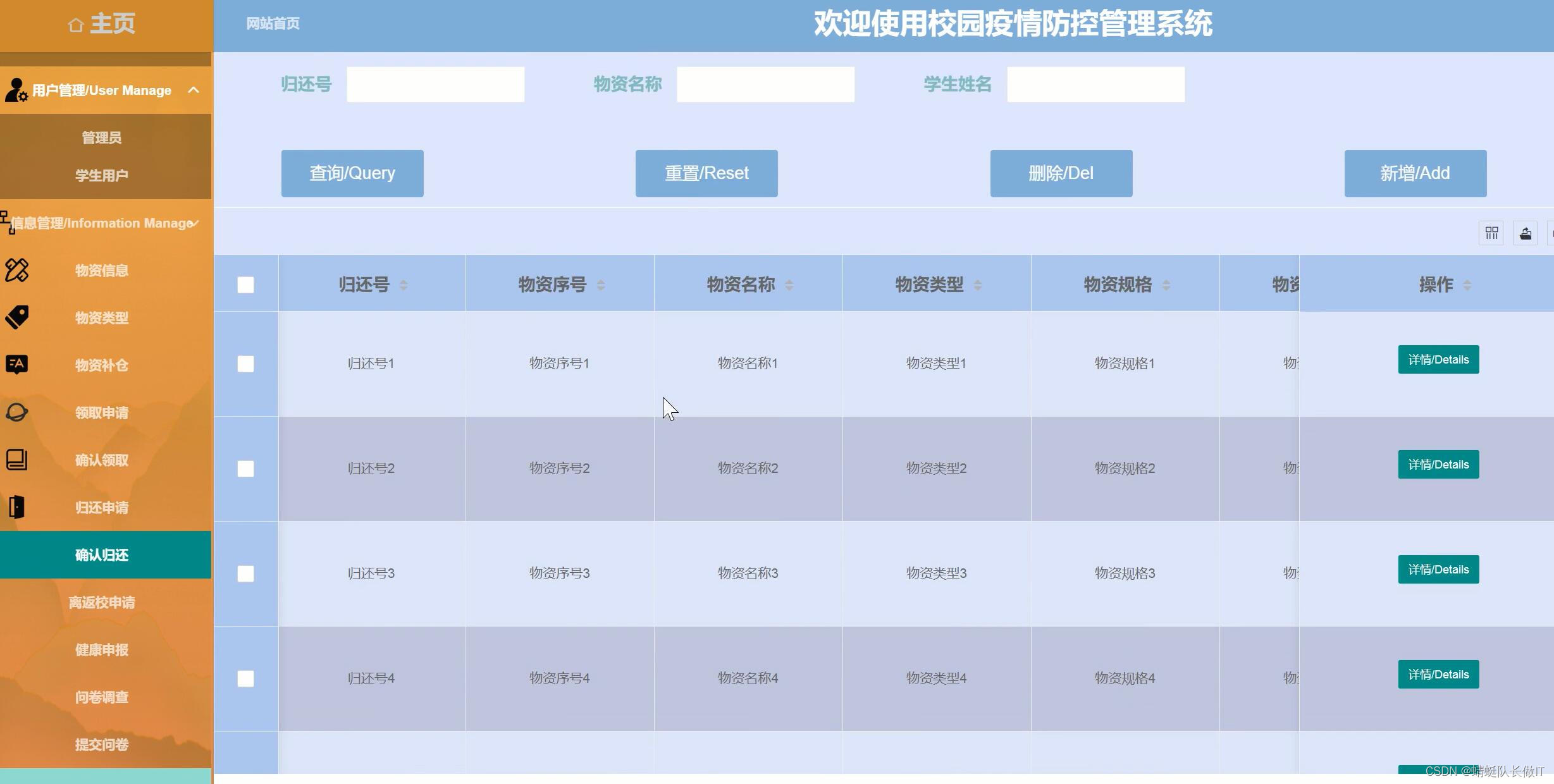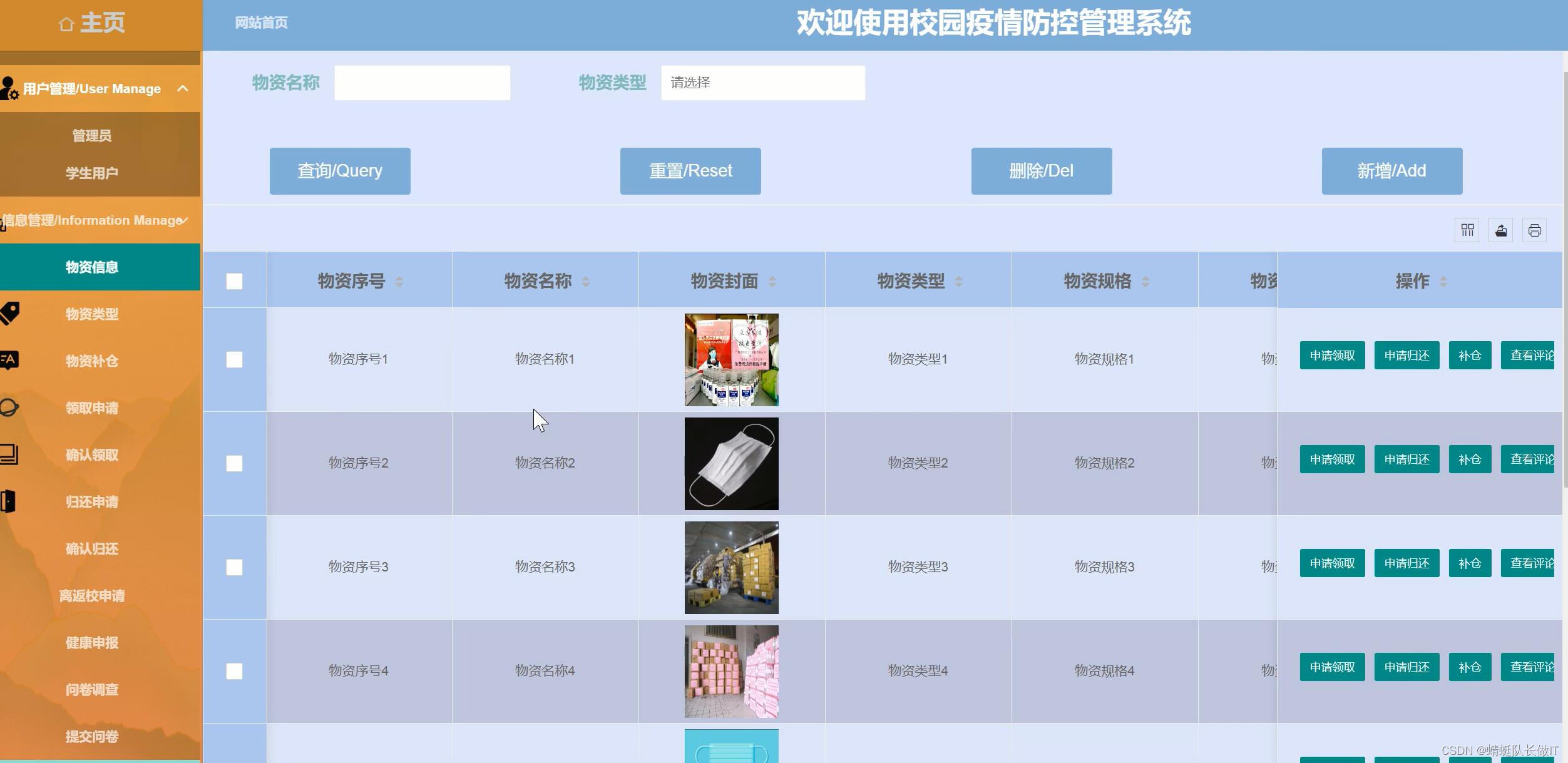 信息管理(物资信息、物资类型、物资补仓、领取申请、确认领取、归还申请、确认归还、离返校申请、