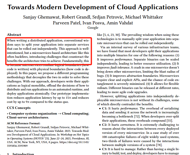 今年6月,一群谷歌员工(由谷歌软件工程师Michael Whittaker领导)发表了一篇名为“Towards Modern Development of Cloud Applications”的论文,开篇就对当下的微服务架构开怼。