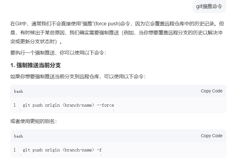 --force:直接覆盖远程分支,不检查远程是否有新提交,可能导致数据丢失。