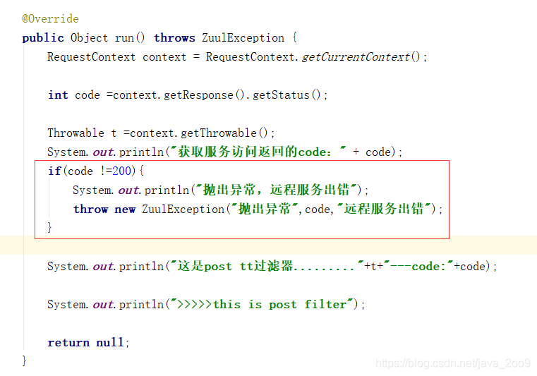 11.4.3 增加一个post 过滤器,在过滤器中获取远程服务返回的code ,如果code 不是200就抛出一个Zuul 异常.