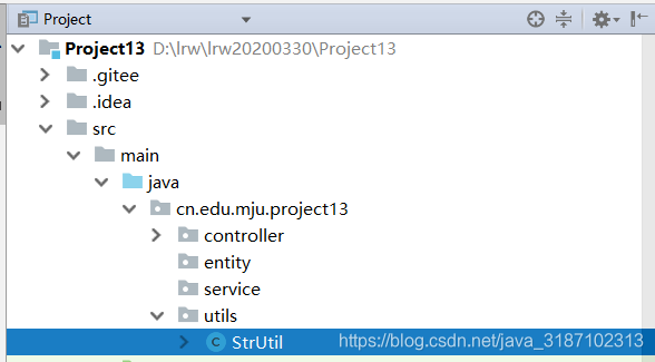 1.首先在main文件夹中创建一个java文件夹标记为源码根,在java文件夹内创建包,在刚刚创建的包中创建名为StrUtil的Java类。如图所示: