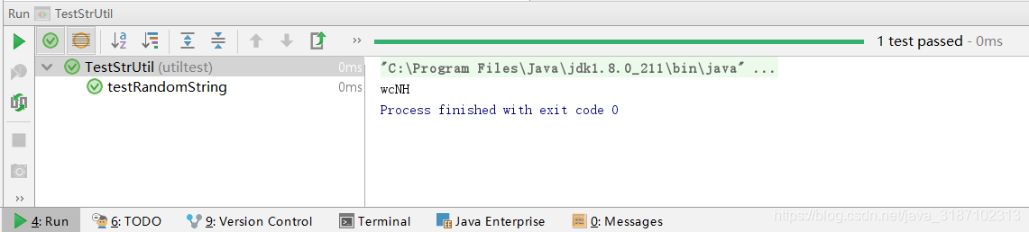 5.选中名为TestStrUtil的java类并右击Run运行进行测试。(由于这次测试我输入的参数是4,所以会输出4个随机字符)