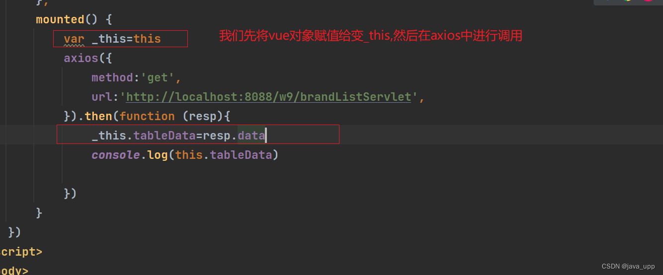 当我们使用vue与axios结合时,一定要注意如果我们想要在axiox中调用vue中的属性或是为vue中的属性赋值时,我们一定要先用一个变量来接收vue对象,然后在axios中进行调用,切不可直接在axios中直接调用vue对象