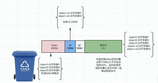 对象动态年龄判断:该机制一般再minor gc之后触发;也就是说Eden区经过垃圾回收会有一批对象存活,这批存活的对象大小之和如果超过了存放对象的那个S区的50%(-XX:TargetSurvivorRatio可以指定),那么S区中分代年龄大于等于这批将要移动过来对象集合中最大分代年龄的对象,统一移动到老年代。