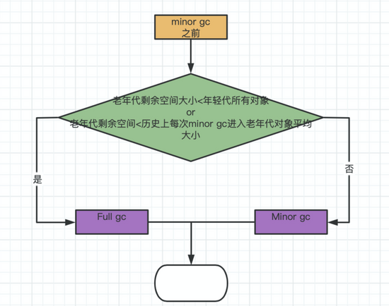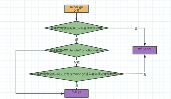 “-XX:-HandlePromotionFailure”(jdk1.8默认就有)的参数是否设置了。如果有这个参数,就会看看老年代的可用内存大小,是否大于之前每一次minor gc 后进入老年代的对象平均大小。如果上一步结果是小于或者之前说的参数没有设置,那么就会触发一次Full gc,对老年代和年轻代一起回收一次垃圾,如果回收完还是没有足够空间存放新的对象就会发生OOM。当然,如果minor gc之后剩余存活的需要挪动到老年代的对象大小还是大于老年代可用空间,那么也会触发Full gc,full gc完之后如果还是没有空间放minor gc之后的存活对象,也会放生OOM。
