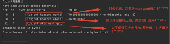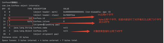 package com.jvm;/*** 描述 告白** @author 阿牛* @version 1.0* @date 2022/06/05 15:13:48*/public class Confess {int id;String name;byte islove;Object info;}package com.jvm;import org.openjdk.jol.info.ClassLayout;/*** 描述 计算对象大小** @author 阿牛* @version 1.0* @date 2022/06/05 14:54:31*/public class ObjectMarkWord {public static void main(String[] args) {ClassLayout layout = ClassLayout.parseInstance(new Object());System.out.println("Object对象输出...");System.out.println(layout.toPrintable());System.out.println("---------------\n");ClassLayout intLayout = ClassLayout.parseInstance(new int[]{});System.out.println("int[]对象输出...");System.out.println(intLayout.toPrintable());System.out.println("---------------\n");ClassLayout confessLayout = ClassLayout.parseInstance(new Confess());System.out.println("Confess对象输出...");System.out.println(confessLayout.toPrintable());}}/*/Library/Java/JavaVirtualMachines/jdk1.8.0_291.jdk/Contents/Home/bin/java -javaagent:/Applications/IntelliJ IDEA.app/Contents/lib/idea_rt.jar=53584:/Applications/IntelliJ IDEA.app/Contents/bin -Dfile.encoding=UTF-8 -classpath /Library/Java/JavaVirtualMachines/jdk1.8.0_291.jdk/Contents/Home/jre/lib/charsets.jar:/Library/Java/JavaVirtualMachines/jdk1.8.0_291.jdk/Contents/Home/jre/lib/deploy.jar:/Library/Java/JavaVirtualMachines/jdk1.8.0_291.jdk/Contents/Home/jre/lib/ext/cldrdata.jar:/Library/Java/JavaVirtualMachines/jdk1.8.0_291.jdk/Contents/Home/jre/lib/ext/dnsns.jar:/Library/Java/JavaVirtualMachines/jdk1.8.0_291.jdk/Contents/Home/jre/lib/ext/jaccess.jar:/Library/Java/JavaVirtualMachines/jdk1.8.0_291.jdk/Contents/Home/jre/lib/ext/jfxrt.jar:/Library/Java/JavaVirtualMachines/jdk1.8.0_291.jdk/Contents/Home/jre/lib/ext/localedata.jar:/Library/Java/JavaVirtualMachines/jdk1.8.0_291.jdk/Contents/Home/jre/lib/ext/nashorn.jar:/Library/Java/JavaVirtualMachines/jdk1.8.0_291.jdk/Contents/Home/jre/lib/ext/sunec.jar:/Library/Java/JavaVirtualMachines/jdk1.8.0_291.jdk/Contents/Home/jre/lib/ext/sunjce_provider.jar:/Library/Java/JavaVirtualMachines/jdk1.8.0_291.jdk/Contents/Home/jre/lib/ext/sunpkcs11.jar:/Library/Java/JavaVirtualMachines/jdk1.8.0_291.jdk/Contents/Home/jre/lib/ext/zipfs.jar:/Library/Java/JavaVirtualMachines/jdk1.8.0_291.jdk/Contents/Home/jre/lib/javaws.jar:/Library/Java/JavaVirtualMachines/jdk1.8.0_291.jdk/Contents/Home/jre/lib/jce.jar:/Library/Java/JavaVirtualMachines/jdk1.8.0_291.jdk/Contents/Home/jre/lib/jfr.jar:/Library/Java/JavaVirtualMachines/jdk1.8.0_291.jdk/Contents/Home/jre/lib/jfxswt.jar:/Library/Java/JavaVirtualMachines/jdk1.8.0_291.jdk/Contents/Home/jre/lib/jsse.jar:/Library/Java/JavaVirtualMachines/jdk1.8.0_291.jdk/Contents/Home/jre/lib/management-agent.jar:/Library/Java/JavaVirtualMachines/jdk1.8.0_291.jdk/Contents/Home/jre/lib/plugin.jar:/Library/Java/JavaVirtualMachines/jdk1.8.0_291.jdk/Contents/Home/jre/lib/resources.jar:/Library/Java/JavaVirtualMachines/jdk1.8.0_291.jdk/Contents/Home/jre/lib/rt.jar:/Library/Java/JavaVirtualMachines/jdk1.8.0_291.jdk/Contents/Home/lib/ant-javafx.jar:/Library/Java/JavaVirtualMachines/jdk1.8.0_291.jdk/Contents/Home/lib/dt.jar:/Library/Java/JavaVirtualMachines/jdk1.8.0_291.jdk/Contents/Home/lib/javafx-mx.jar:/Library/Java/JavaVirtualMachines/jdk1.8.0_291.jdk/Contents/Home/lib/jconsole.jar:/Library/Java/JavaVirtualMachines/jdk1.8.0_291.jdk/Contents/Home/lib/packager.jar:/Library/Java/JavaVirtualMachines/jdk1.8.0_291.jdk/Contents/Home/lib/sa-jdi.jar:/Library/Java/JavaVirtualMachines/jdk1.8.0_291.jdk/Contents/Home/lib/tools.jar:/Users/niuyanpeng/goodfuture/selfproject/SpringBootTest/target/classes:/Users/niuyanpeng/goodfuture/soft/apache-maven-3.8.1/repository/org/springframework/boot/spring-boot-starter/2.3.2.RELEASE/spring-boot-starter-2.3.2.RELEASE.jar:/Users/niuyanpeng/goodfuture/soft/apache-maven-3.8.1/repository/org/springframework/boot/spring-boot/2.3.2.RELEASE/spring-boot-2.3.2.RELEASE.jar:/Users/niuyanpeng/goodfuture/soft/apache-maven-3.8.1/repository/org/springframework/spring-context/5.2.8.RELEASE/spring-context-5.2.8.RELEASE.jar:/Users/niuyanpeng/goodfuture/soft/apache-maven-3.8.1/repository/org/springframework/spring-aop/5.2.8.RELEASE/spring-aop-5.2.8.RELEASE.jar:/Users/niuyanpeng/goodfuture/soft/apache-maven-3.8.1/repository/org/springframework/spring-expression/5.2.8.RELEASE/spring-expression-5.2.8.RELEASE.jar:/Users/niuyanpeng/goodfuture/soft/apache-maven-3.8.1/repository/org/springframework/boot/spring-boot-autoconfigure/2.3.2.RELEASE/spring-boot-autoconfigure-2.3.2.RELEASE.jar:/Users/niuyanpeng/goodfuture/soft/apache-maven-3.8.1/repository/org/springframework/boot/spring-boot-starter-logging/2.3.2.RELEASE/spring-boot-starter-logging-2.3.2.RELEASE.jar:/Users/niuyanpeng/goodfuture/soft/apache-maven-3.8.1/repository/ch/qos/logback/logback-classic/1.2.3/logback-classic-1.2.3.jar:/Users/niuyanpeng/goodfuture/soft/apache-maven-3.8.1/repository/ch/qos/logback/logback-core/1.2.3/logback-core-1.2.3.jar:/Users/niuyanpeng/goodfuture/soft/apache-maven-3.8.1/repository/org/apache/logging/log4j/log4j-to-slf4j/2.13.3/log4j-to-slf4j-2.13.3.jar:/Users/niuyanpeng/goodfuture/soft/apache-maven-3.8.1/repository/org/apache/logging/log4j/log4j-api/2.13.3/log4j-api-2.13.3.jar:/Users/niuyanpeng/goodfuture/soft/apache-maven-3.8.1/repository/org/slf4j/jul-to-slf4j/1.7.30/jul-to-slf4j-1.7.30.jar:/Users/niuyanpeng/goodfuture/soft/apache-maven-3.8.1/repository/jakarta/annotation/jakarta.annotation-api/1.3.5/jakarta.annotation-api-1.3.5.jar:/Users/niuyanpeng/goodfuture/soft/apache-maven-3.8.1/repository/org/springframework/spring-core/5.2.8.RELEASE/spring-core-5.2.8.RELEASE.jar:/Users/niuyanpeng/goodfuture/soft/apache-maven-3.8.1/repository/org/springframework/spring-jcl/5.2.8.RELEASE/spring-jcl-5.2.8.RELEASE.jar:/Users/niuyanpeng/goodfuture/soft/apache-maven-3.8.1/repository/org/yaml/snakeyaml/1.26/snakeyaml-1.26.jar:/Users/niuyanpeng/goodfuture/soft/apache-maven-3.8.1/repository/org/slf4j/slf4j-api/1.7.30/slf4j-api-1.7.30.jar:/Users/niuyanpeng/goodfuture/soft