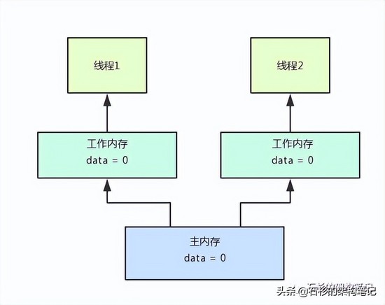 好了,现在大家从图里看到,每个线程都把data这个变量的副本加载到了自己的工作内存里了,所以每个线程都可以读到data = 0这个值。