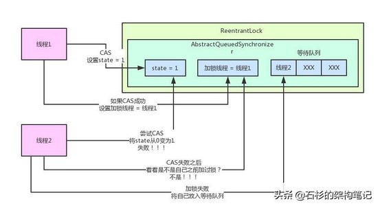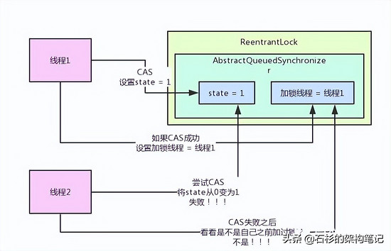 我们来看看锁的互斥是如何实现的?线程2跑过来一下看到,哎呀!state的值不是0啊?所以CAS操作将state从0变为1的过程会失败,因为state的值当前为1,说明已经有人加锁了!