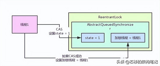 接着线程1跑过来调用ReentrantLock的lock()方法尝试进行加锁,这个加锁的过程,直接就是用CAS操作将state值从0变为1。