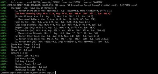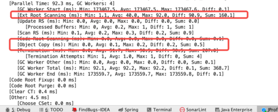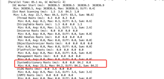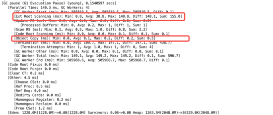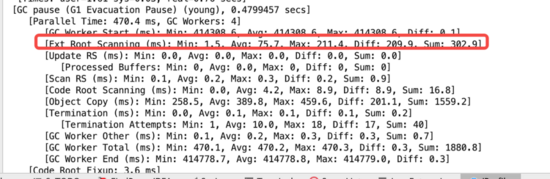 总共花了0.4573432秒,共8核并行执行。仔细,看这些数据,发现有一处很不合理,就是上面红色的那一行。 Ext Root Scanning堆外部根扫描,总共花了596ms,其中最高448ms ,要知道这次ygc也才花457ms,几乎把所有时间都花在这个Ext Root Scanning。