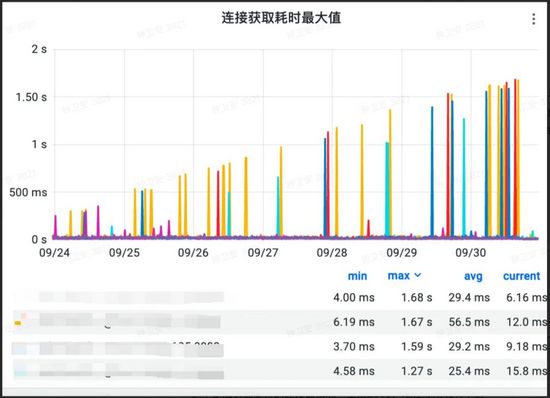 当然,这里显示的是Mysql的获取连接的时间,一直在递增,到了30号,基本上一次需要快2秒钟了。