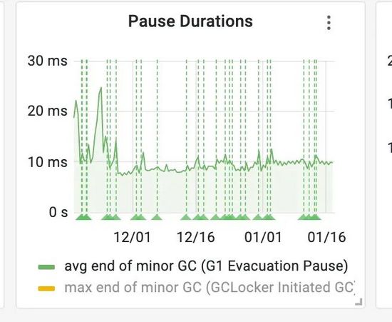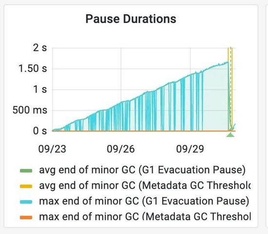 Pause Durations表示的是暂停时间,也就是JVM里面的STW(Stop The World)时间。图表里面avg/max end of minor GC (G1 Evacuation Pause)这个代表的是G1里面的young-gc。此刻, 我们知道G1里面的YGC有问题,但是还不够,因为我们需要知道具体问题点在哪呢?又什么原因导致的呢?