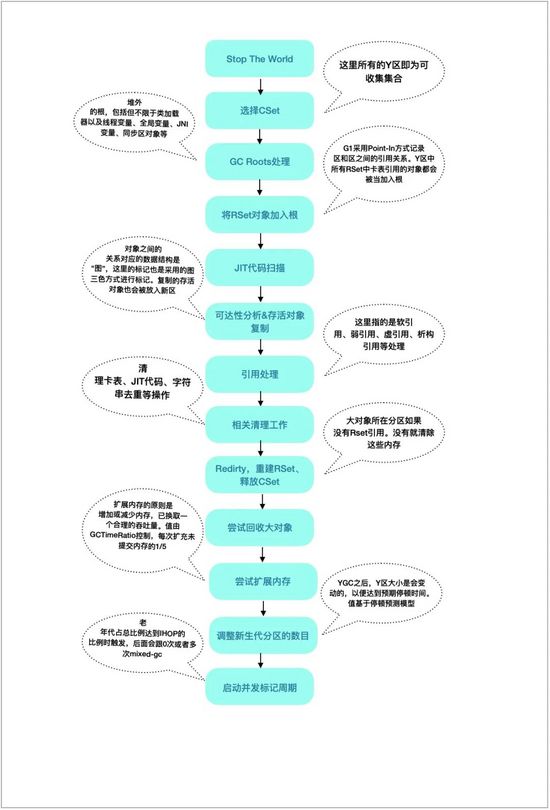 在分配内存的时候,如果剩余的空间不能满足要分配的对象的时候,就会优先触发新生代回收,即young-gc(YGC)。G1中的YGC触发时,会一次性回收全部的新生代内存以及空的大对象区(前提是分区没有RSet引用)。目前比较新的垃圾收集器例如ZGC、Shenandoah都被称之为低延迟垃圾收集器,其目标是在任意内存下,保证停顿时间都保持在十毫秒以内。可见低延迟在垃圾收集器中的重要性。但是在G1中的YGC,它全部过程都是处于STW的,也就是说YGC的过程中,服务器是处于停顿状态中的。这也就解释了为什么Mysql获取连接超时他其实是现象而不是原因,因为不单单是Mysql获取连接, 在YGC的时候,除了 GC 线程之外整个服务器的所有Mutator线程( Java 应用线程)都停止了 ,服务卡顿便如此由来。