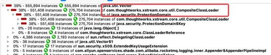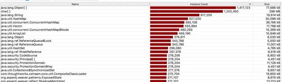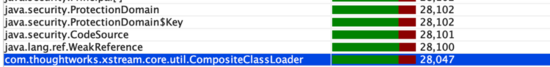 这里可看到堆里面这个CompositeClassLoader这个类的对象偏多。要知道类加载器在系统中负责对类进行加载,通过传入一个类的全限定名称返回一个唯一的确定的类实例。这实属不正常。通过其包名字得知是xstream下面的(xstream是用于处理XML文件的序列化以及反序列化等操作)。