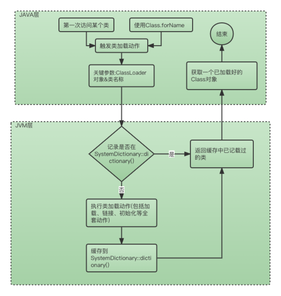 在java里面唯一确认一个类的方式就是 类加载器+类全限定名称,并且在类加载里面存在缓存机制,同一个类加载器+类限定名加载的类仅会加载一次,从上面的代码可以看到,这个记录它就记录在SystemDictionary::dictionary()里面!大致加载流程如下: