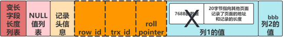 Dynamic 行存储格式下,对于处理行溢出(当一个字段存储长度过大时,会发生行溢出)时,仅存放溢出页内存地址。