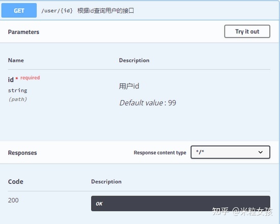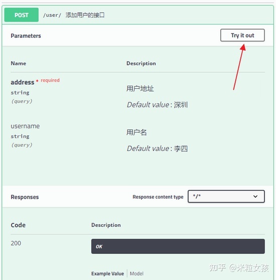 可以看到,接口的参数,参数要求,参数默认值等等统统都展示出来了,参数类型下的 query 表示参数以 key/value 的形式传递,点击右上角的 Try it out,就可以进行接口测试: