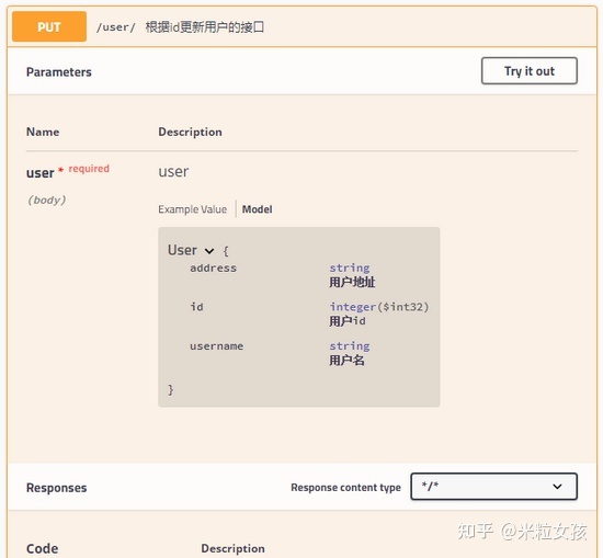 @ApiModel public class User { @ApiModelProperty(value = "用户id") private Integer id; @ApiModelProperty(value = "用户名") private String username; @ApiModelProperty(value = "用户地址") private String address; //getter/setter }