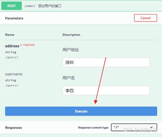 点击 Execute 按钮,表示发送请求进行测试。测试结果会展示在下面的 Response 中。