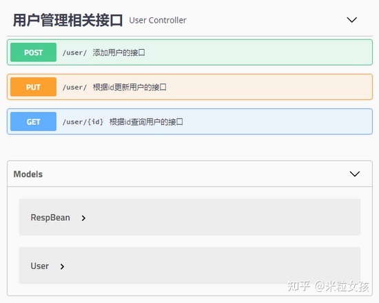 @RestController @Api(tags = "用户管理相关接口") @RequestMapping("/user") public class UserController { @PostMapping("/") @ApiOperation("添加用户的接口") @ApiImplicitParams({ @ApiImplicitParam(name = "username", value = "用户名", defaultValue = "李四"), @ApiImplicitParam(name = "address", value = "用户地址", defaultValue = "深圳", required = true) }) public RespBean addUser(String username, @RequestParam(required = true) String address) { return new RespBean(); } @GetMapping("/") @ApiOperation("根据id查询用户的接口") @ApiImplicitParam(name = "id", value = "用户id", defaultValue = "99", required = true) public User getUserById(@PathVariable Integer id) { User user = new User(); user.setId(id); return user; } @PutMapping("/{id}") @ApiOperation("根据id更新用户的接口") public User updateUserById(@RequestBody User user) { return user; } }