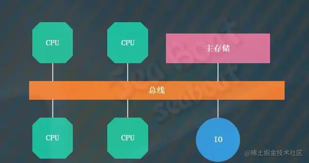 UMA架构的性质就是每个CPU核访问主存储的时间都是一样的。下面看基于总线的UMA架构,一共有4个CPU处理器,它们都直接与总线连接,通过总线进行通信。从这个结构中可以看到,每个CPU都没有区别,它们平等地访问主存储。访问主存储所需的时间都是一样的,即为统一内存访问。