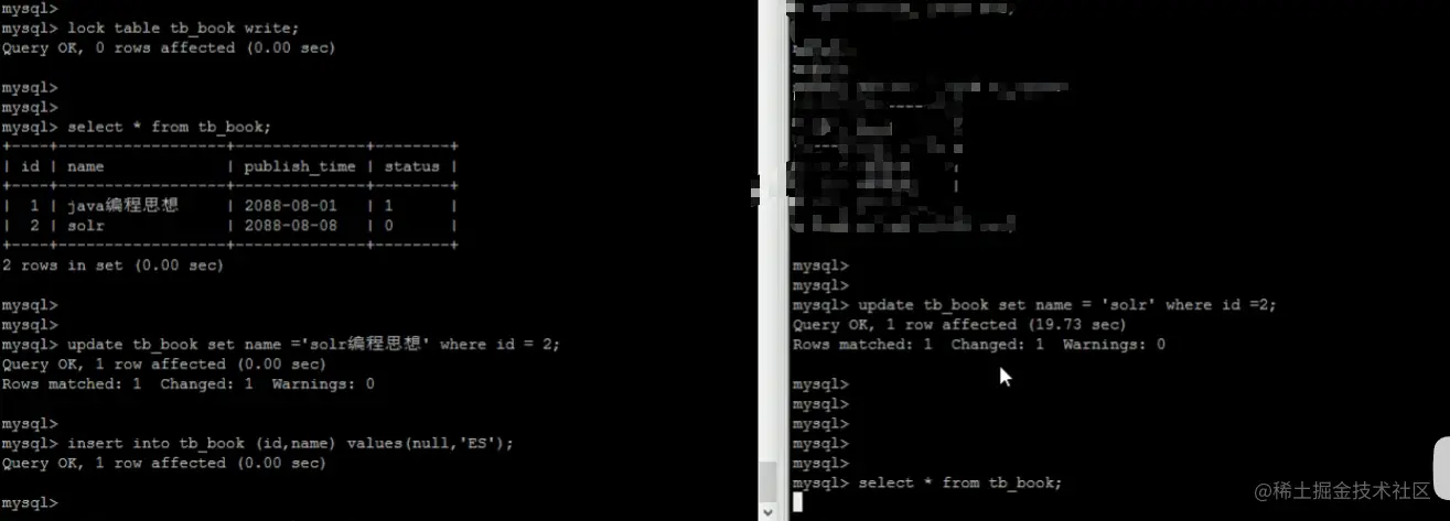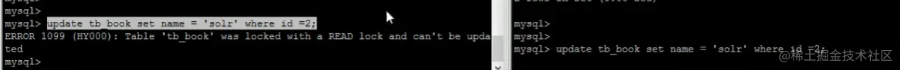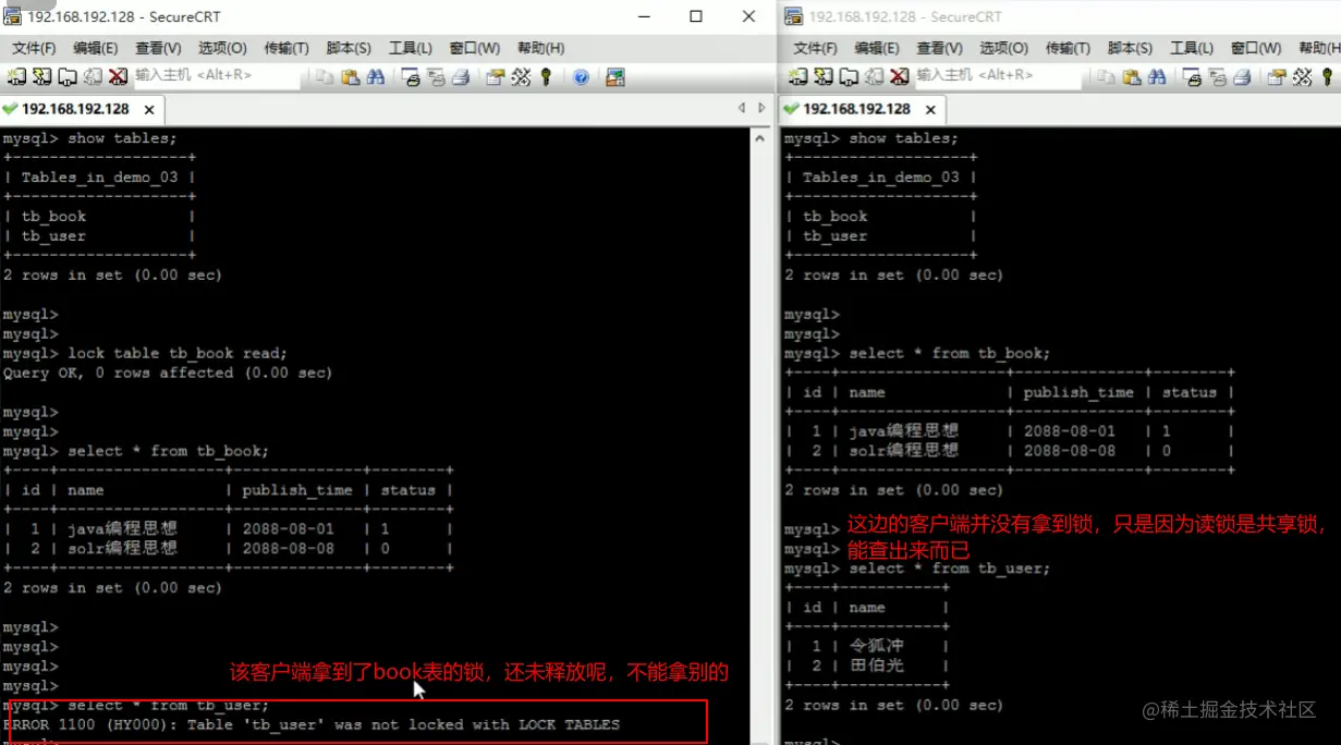 客户端一对book表加了锁,并拿到了book表的锁,在该锁未释放之前,不能去查别的表;